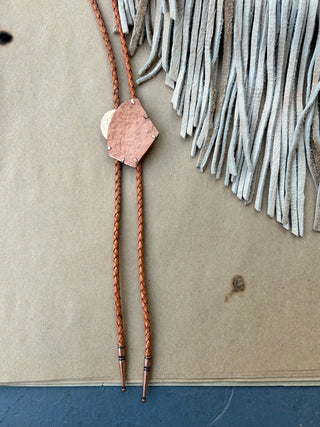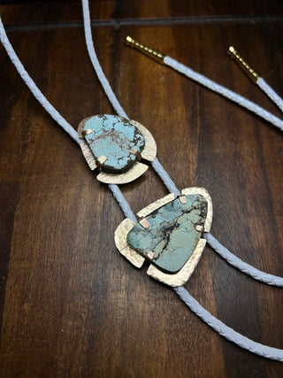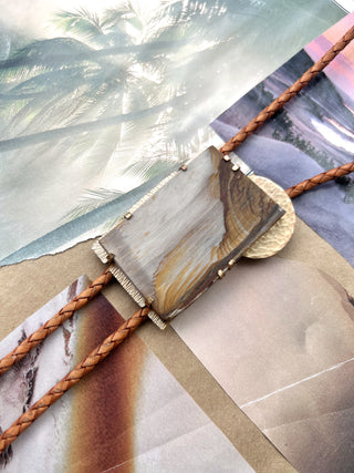 EACH OF THE BOLO TIES I CREATE ARE ONE OF A KIND AND CRAFTED WITH A VARIETY OF DETAILS. THESE PIECES ARE TRULY COLLECTORS ITEMS, THEY ARE BOUND TO LAST FOR YEARS TO COME AND ARE CURATED IN A WAY THAT IS TRUE TO MY STYLE AND AESTHETIC. ALL BOLO TIES COME WITH A PERSONALIZED MESSAGE ON THE BACK, A SIGNATURE ASPECT OF MY DESIGN PROCESS. I WOULD BE HAPPY TO CUSTOMIZE A PIECE FOR YOU, MY CUSTOMS ARE ALWAYS OPEN.