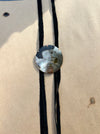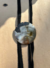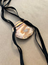This smoky colored mother of pearl piece is so stunning. The leather is cut and frayed a bit to give a rougher feel that adds to the aesthetic of the darker mother of pearl.