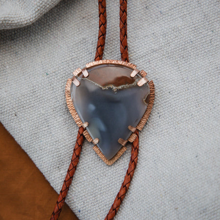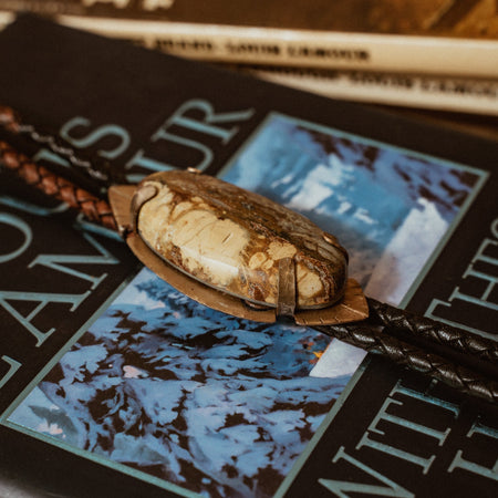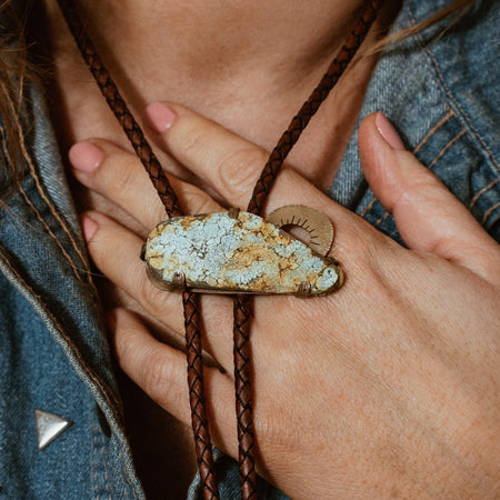 EACH OF THE BOLO TIES I CREATE ARE ONE OF A KIND AND CRAFTED WITH A VARIETY OF DETAILS. THESE PIECES ARE TRULY COLLECTORS ITEMS, THEY ARE BOUND TO LAST FOR YEARS TO COME AND ARE CURATED IN A WAY THAT IS TRUE TO MY STYLE AND AESTHETIC. ALL BOLO TIES COME WITH A PERSONALIZED MESSAGE ON THE BACK, A SIGNATURE ASPECT OF MY DESIGN PROCESS. I WOULD BE HAPPY TO CUSTOMIZE A PIECE FOR YOU, MY CUSTOMS ARE ALWAYS OPEN.