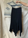 Very Stevie nicks ! This skirt is jet black with an asymmetrical hem. It's stretchy and can be belted for the perfect vibe! Even if you're a little smaller than the listed size, a belt would make it easy to cinch. I've also safety pinned skirts at the waist to help hold them in place