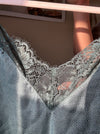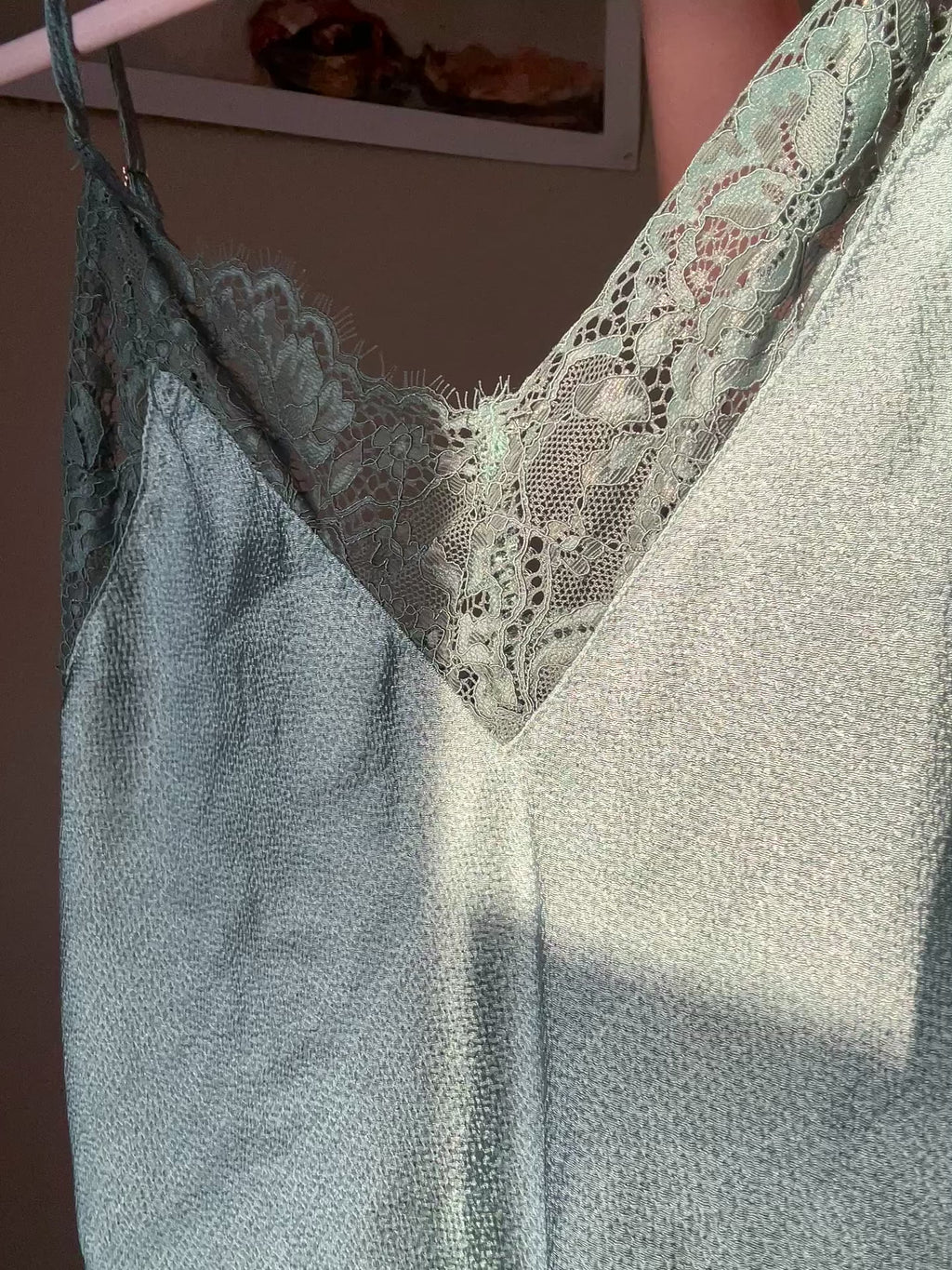 This is my favorite type of lace. I love how the lace is a bit darker than the shirt, but yet still the same color basically. Immaculate condition. The texture of the shirt is amazing. The brand is Lineau Donatella